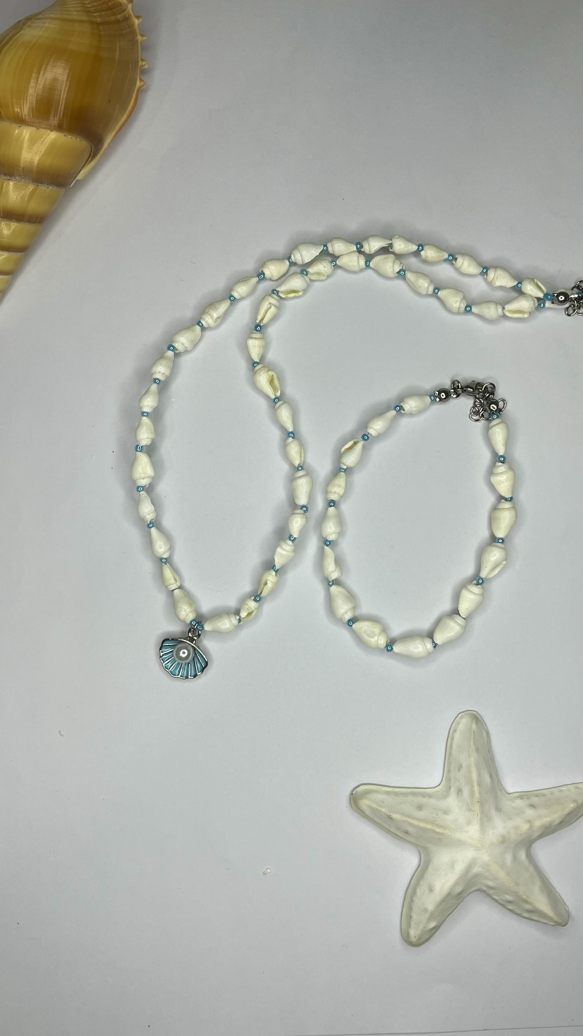ست گردنبند و دستبند صدفی با پلاک صدف ابی